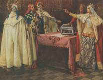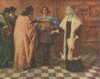 widzimy monarchinię w ciemnozielonej sukni. Władczyni oddaje skrzynię klejnotów na